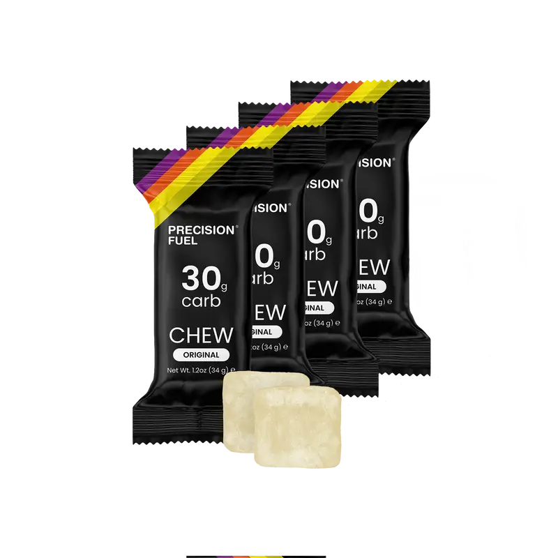 Precision Fuel energy chews deliver 15g of carbs per chew in a lightweight, refreshing Mint & Lemon flavor. Perfect for hot conditions and a satisfying alternative to gels, they simplify your fueling strategy with clear carb info on the packaging.